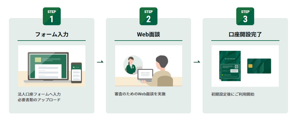 三井住友銀行の「Trunk」における法人口座の開設は、3ステップで進められます。