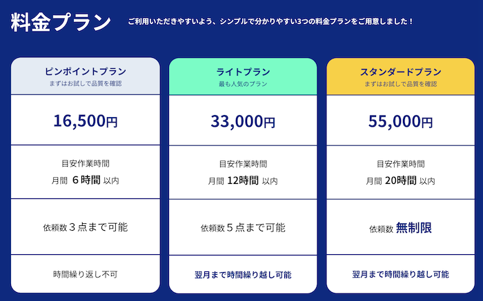 月額33,000円のライトプランは、最も人気の高いプランです。月間12時間以内の作業時間で、5点までの依頼ができます。さらに、使い切れなかった時間は翌月まで繰り越せるため、無駄なく活用できる点が支持されています。