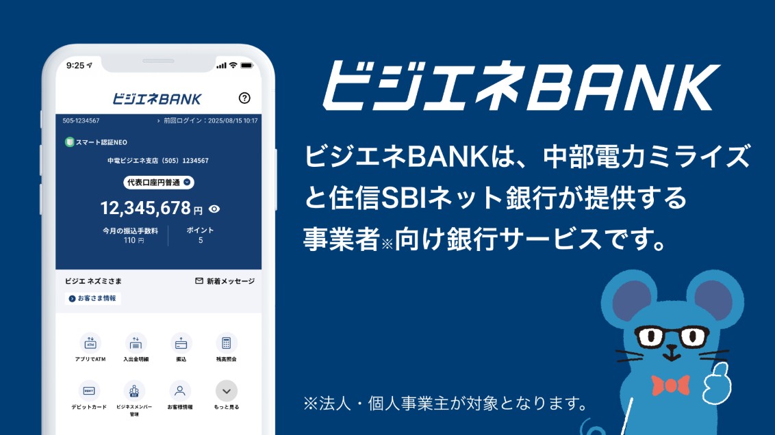 ビジエネBANKは、中部電力ミライズ株式会社(※2)と住信SBIネット銀行株式会社が連携し、2025年9月24日より提供を開始した法人・個人事業主向けの銀行サービスです。