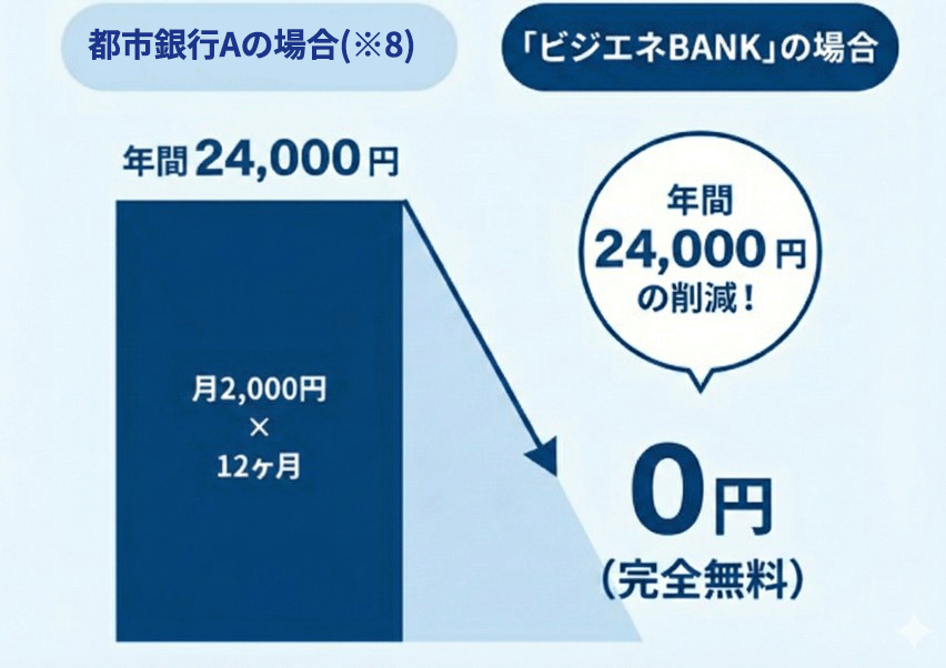 例えば都市銀行Aの法人口座では月額1,760円(※4)の基本料金(銀行口座の維持費、インターネットバンク利用料)が発生します。しかし、ビジエネBANKならこれらのランニングコストを0円に抑えられます。