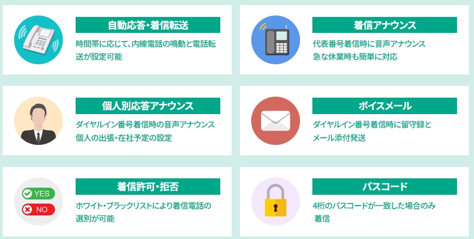 「まとめてクラウドPBX」は、単に電話を繋ぐだけでなく、少人数の組織でも効率的に電話応対ができる機能を標準装備しています。これらの機能を上手く活用すれば、電話応対業務を効率化できます。