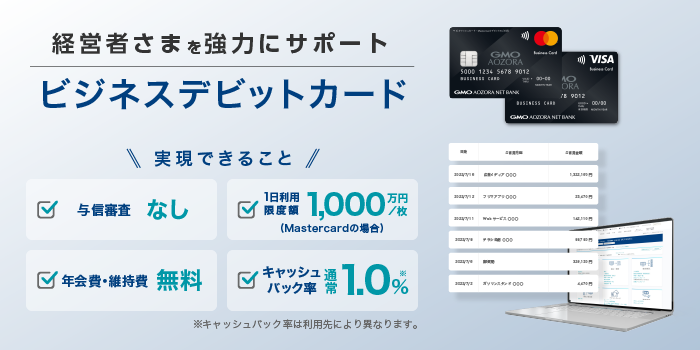 GMOあおぞらネット銀行のビジネスデビットカードは、利用金額の通常1%がキャッシュバックされます。小売店、飲食店、ガソリンスタンドなど適用される店舗・サービスは幅広いため、多くの利用シーンで実質的に1%値引きされた状態で買い物が可能です。