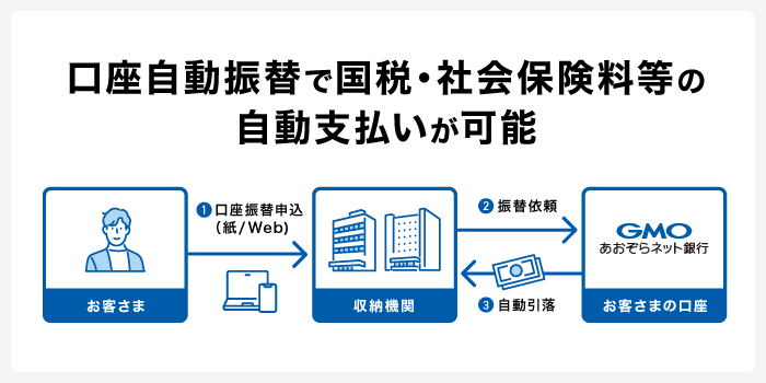 GMOあおぞらネット銀行の口座振替サービスは、クレジットカードの利用料金や携帯電話料金などの一般的なお支払はもちろんのこと、社会保険料や国税の自動引き落としにも対応しています。煩雑な納付手続きを自動化することで、経営者の方々は、より戦略的な業務に時間を使うことができるようになります。