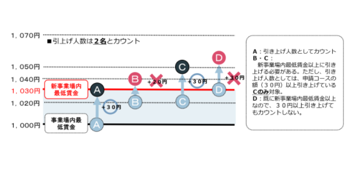 この辺りのルールはやや複雑です。引き上げ前後の賃金と引き上げ額の条件をすべて満たしているか、しっかり確認しましょう。
