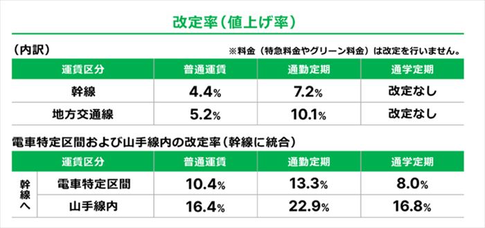 JR東日本では、すべてのエリアにおいて運賃を改定することが決まっています。改定率の内訳は以下のとおりです。
