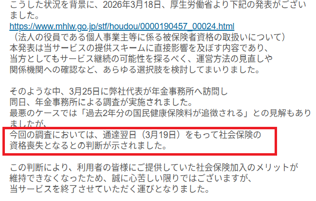 ネット上では「最大2年遡及で数百万円徴収」「延滞金年14.6%」といった情報が多く流れています。しかし実際の運用では、延滞金や遡及徴収が発生しなかった事例も確認されています。実際に社保サービスに加入していた事業主には、以下のようなメールが送られています。