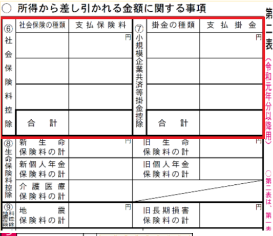 ここに、国民健康保険料・国民年金保険料・介護保険料など、1年間に支払った社会保険料の合計金額を記入します。国民健康保険料だけでなく、すべての社会保険料を合算した総額を書く点がポイントです。