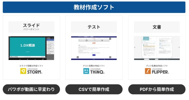 LOGOSWARE Xeを提供するロゴスウェアは、3つの教材作成ソフトウェアを提供しています。これらのソフトウェアを活用すれば、誰でも簡単に社内のノウハウを教材にすることができます。