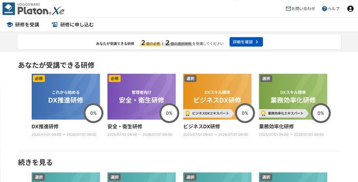 LOGOSWARE Xeは直感的に操作できるインターフェースも魅力です。マルチデバイス対応で、受講者はいつでもどこでも学べます。受講したい講座をすぐに見つけられて、学習状況も把握しやすいです。そのため、モチベーションを維持しながら学習し続けられます。