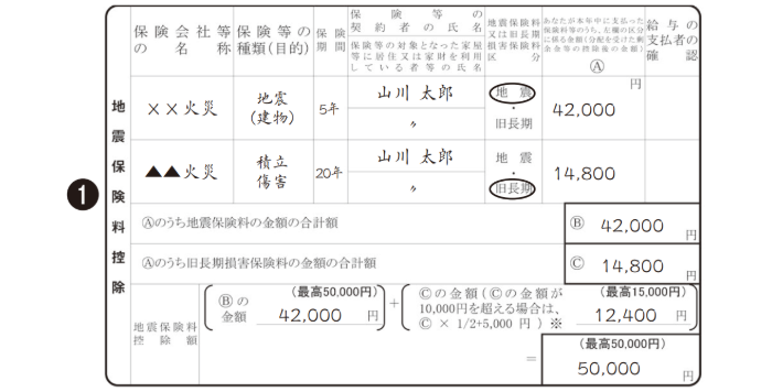 書き方の流れは「生命保険料控除」と同じです。「地震保険又は旧長期損害保険料の区分」は、2006年以前に契約したものであれば「旧長期」、2007年以降の契約であれば「地震」にマルをつけます。