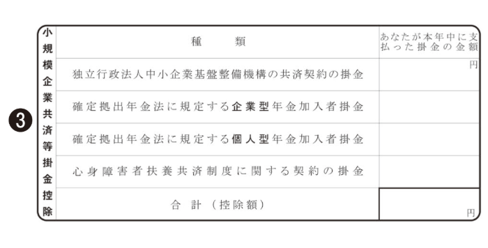 小規模企業共済は、主に中小規模の企業の経営者や役員、個人事業主が退職金を積み立てる制度です。確定拠出年金(企業型DC、iDeCo)の掛金も控除対象となるので、支払っている場合は記入しましょう。