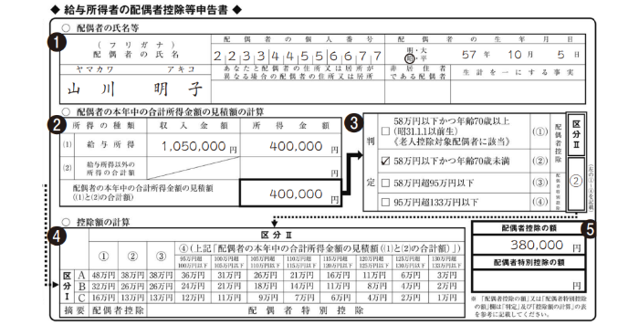 - 配偶者の所得の見積額が95万円以下=配偶者控除等申告書で判定した区分Ⅱが➀~➂