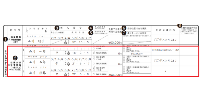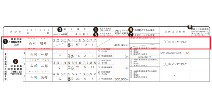 扶養する親族に該当する人がいなければ、自身の情報以外は記入しなくて構いません。以下で各欄の詳細を説明します。