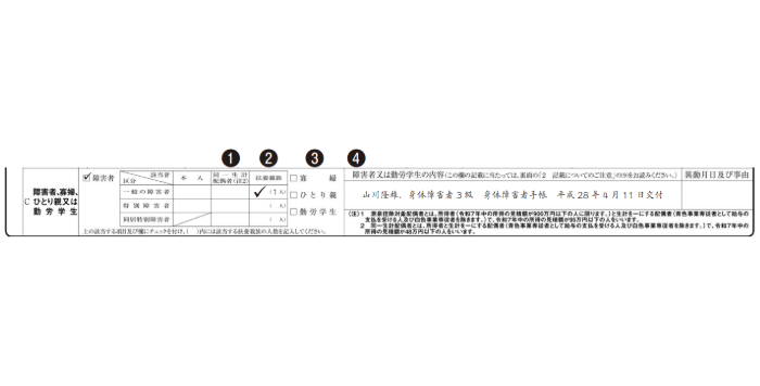 チェックを入れた欄に応じて、右側の「扶養親族等」と「特別障害者」の欄を埋めてください。