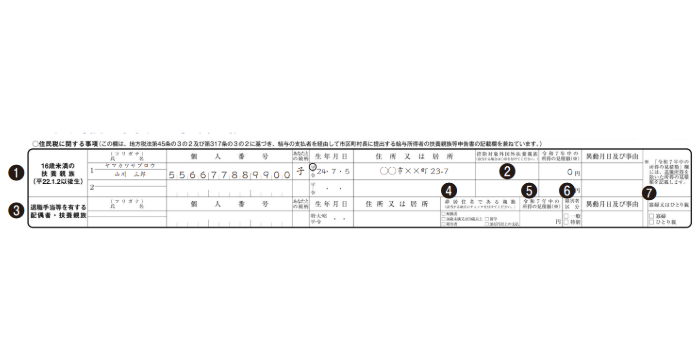 「控除対象扶養親族(16歳以上)」の欄には、16歳以上の扶養親族の情報を書きます。扶養親族とは、申告者が扶養している子供や親(6親等内の血族および3親等内の姻族)で、所得見積額が48万円以下の人です。