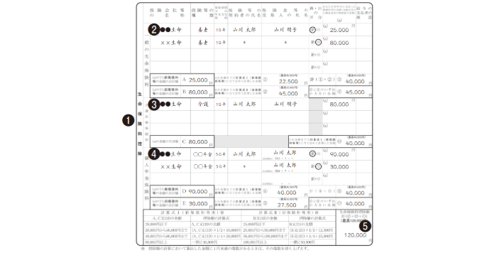 計算式Ⅰでは年間の保険料が8万円超であれば控除額は一律4万円、計算式Ⅱでは保険料10万円超で控除額は一律5万円です。年間の保険料が8万円、10万円となる保険があれば、それを1つ記入すれば最大額の控除が適用されます。