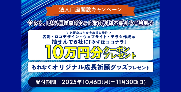2025年10月27日みずほ銀行「法人口座開設キャンペーン」実施中!【11/30(日)まで】