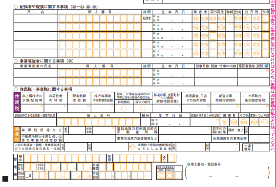ここまでにもそれぞれの項目で[第二表]を記入してきたところですが、最後に「配偶者や親族に関する事項」「事業専従者に関する事項」「住民税・事業税に関する事項」を記入します。