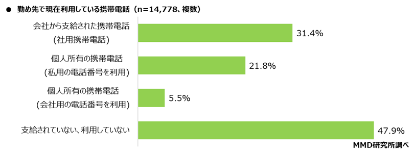 会社から携帯電話を支給されていると回答した人は31.4%にとどまっています。対して、個人携帯(私用番号または代表番号)を業務利用している層は合計27.3%にのぼり、支給端末を利用する層に迫る実態が明らかとなりました。