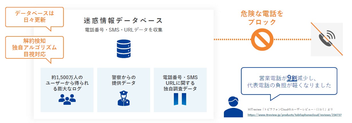 トビラシステムズが警察や自治体、利用者から収集した数千万件規模の迷惑電話データベースを活用し、しつこい営業電話や悪質な勧誘を自動でブロックします。