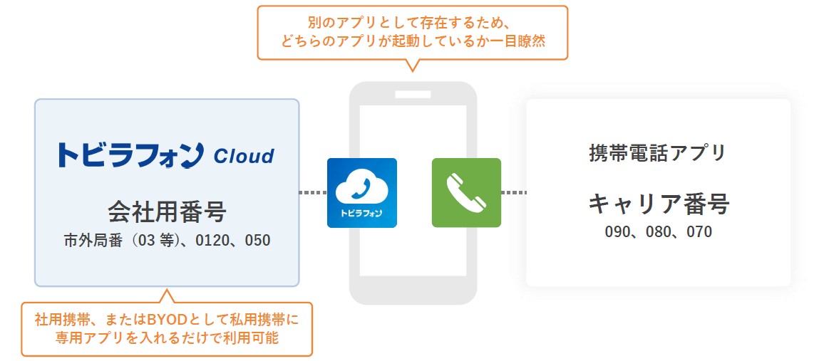 クラウドPBXなどの専用アプリを導入すれば、1台の端末で「個人番号」と「業務用番号」を明確に使い分けることが可能になります。