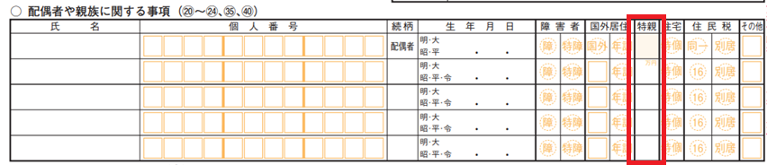また第二表では「配偶者や親族に関する事項」に特定親族特別控除を意味する「特親(万円)」の欄が新設されています。