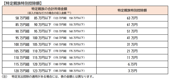上記の通り、特定親族特別控除額は最大63万円です。特定親族の合計所得金額が85万円以下まで扶養控除(特定扶養親族※1)と同等の控除が受けられ、以降も123万円以下(給与所得で188万円以下)まで合計所得金額に応じた控除が適用されます。