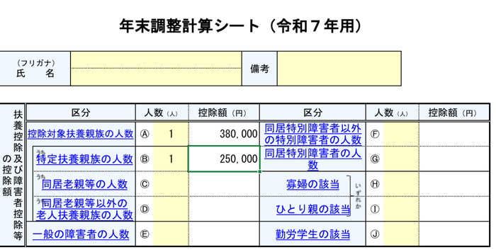 特定親族特別控除額の計算には、国税庁HPでダウンロードできる「年末調整計算シート(令和7年用)」が便利です。「控除対象扶養親族の人数」および「うち特定親族の人数」を入力すると、控除額が自動計算されます。