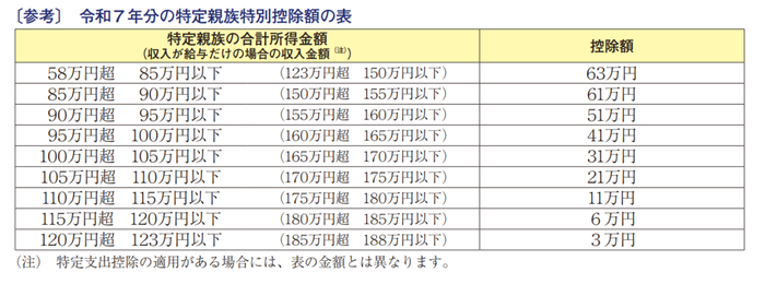 特定親族特別控除は、特定親族の収入に応じて控除額が段階的に減少する仕組みとなっています。特定親族特別控除額は以下の通りです。