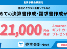 キャンペーンにエントリーした上で、弥生会計 Nextの有償プランを申し込み、初期セットアップ完了&仕訳30件以上登録した方で法人設立から2年以内なら最大42,000円分のAmazonギフトカードがもらえます。